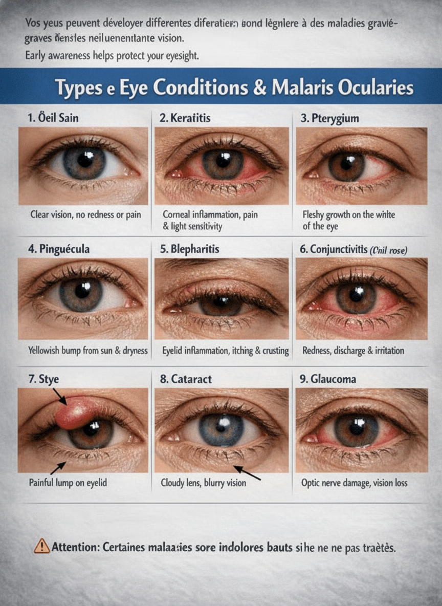 Voici un aperçu détaillé de plusieurs affections oculaires qui touchent des millions de personnes. Connaître les signes distinctifs vous donne le pouvoir d’agir plus rapidement pour préserver votre vision.