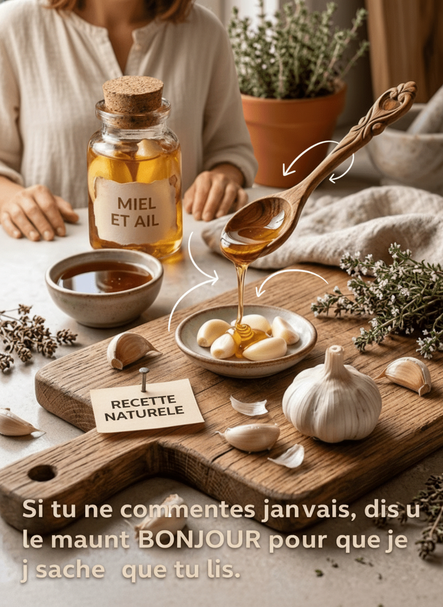 Passé l’âge de 45 ans, l’organisme tend à accumuler l’inflammation, le système immunitaire s’affaiblit, le taux de cholestérol augmente, la tension artérielle peut devenir instable et l’énergie générale diminue. Au Mexique, plus de 60 % des adultes âgés signalent des problèmes d’inflammation chronique et d’immunité défaillante, nombreux sont ceux qui supportent des maux quotidiens sans trouver de remède simple. Les répercussions sont tangibles et contraignantes : douleurs musculaires persistantes, rhumes à répétition, hypercholestérolémie, hypertension, une fatigue qui ne cède pas et la sensation permanente de « ne pas être en pleine forme ». Combien de fois avez-vous ressenti votre corps enflammé, attrapé un rhume sans cesse ou manqué d’énergie malgré un repos suffisant ? Et si un rituel de seulement sept jours pouvait vous aider à diminuer l’inflammation, à renforcer vos défenses naturelles et à améliorer votre bien-être global ? Continuez votre lecture, car la consommation d’ail et de miel à jeun pendant une semaine pourrait bien être le changement que votre corps sollicite. Vous pourriez vous demander : « De l’ail et du miel à jeun ? Cela semble intense. » Cette alliance est puissante mais généralement bien tolérée. Des recherches indiquent que l’ail libère de l’allicine et des composés soufrés, tandis que le miel facilite leur assimilation et adoucit leur impact. Imaginez-vous vous sentir plus robuste, moins sujet à l’inflammation et débordant d’énergie. Êtes-vous prêt à explorer les huit bienfaits qui se manifestent dans votre corps au cours de ces sept jours ?