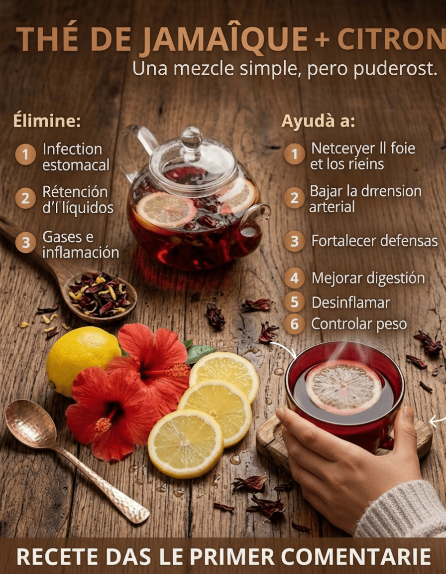 Passé 45 ou 50 ans, notre organisme connaît souvent des changements : l’inflammation tend à s’accumuler, la glycémie peut augmenter, la tension artérielle se dérégler, le taux de cholestérol grimper, et le risque cardiovasculaire s’accroître. Au Mexique, par exemple, près de la moitié des seniors souffrent d’hypertension, plus de 14 millions sont diabétiques, et l’inflammation chronique est une cause fréquente de fatigue et de diverses pathologies. Les répercussions sont tangibles et contraignantes : fatigue persistante, jambes gonflées, maux de tête récurrents, risque d’infarctus, prise de poids difficile à gérer, et une sensation générale de lourdeur qui altère la joie de vivre. Combien de fois avez-vous eu l’impression que votre corps « n’était plus le même », que les médicaments n’offraient qu’un contrôle temporaire, ou que vous peiniez à trouver des solutions naturelles efficaces ? Et si une simple infusion, préparée chez vous, pouvait contribuer à réguler votre tension, votre glycémie, à réduire l’inflammation et à purifier votre organisme ? Continuez votre lecture, car l’infusion d’hibiscus et de citron pourrait bien être ce remède puissant et à portée de main.