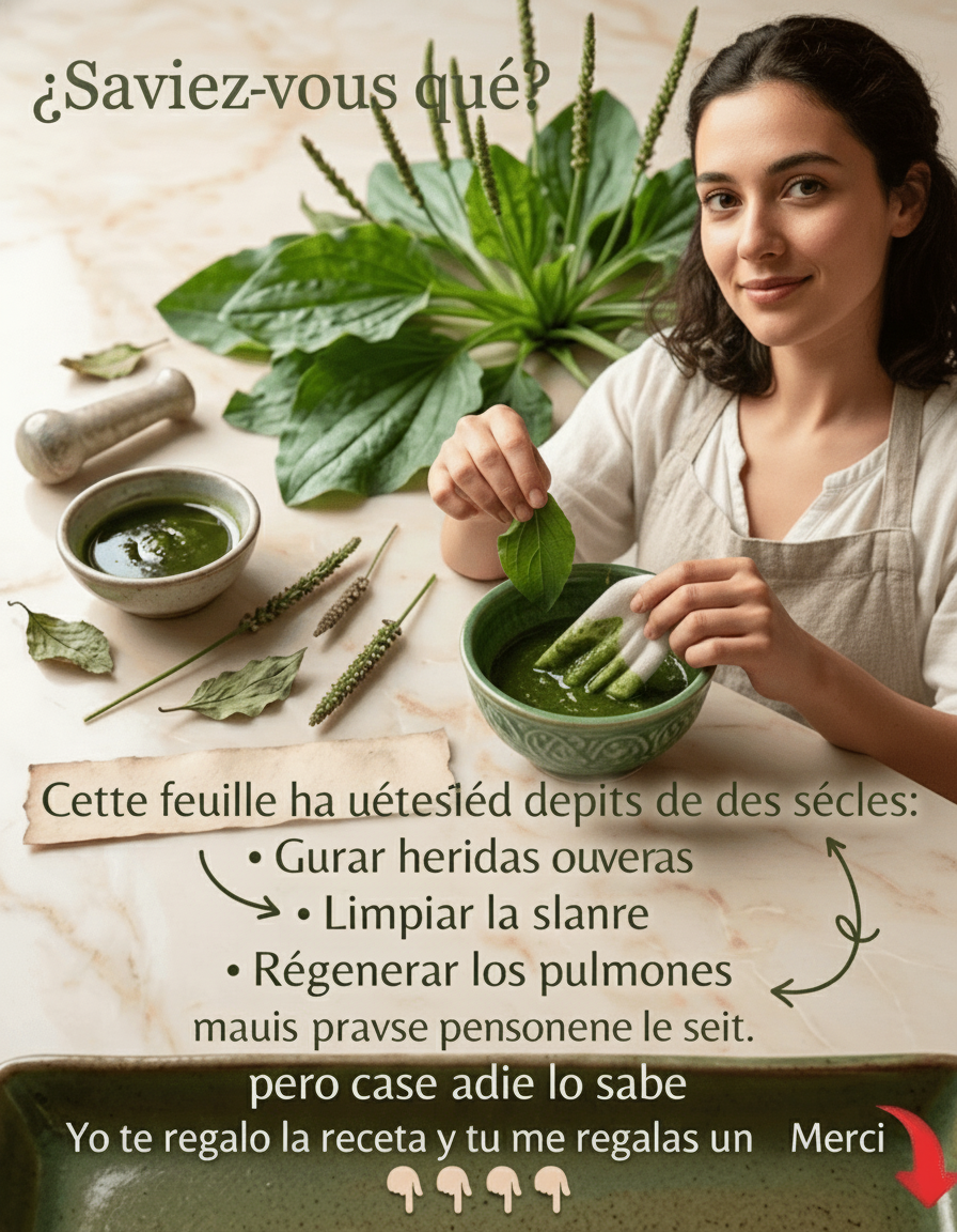 Ressentez comment la blessure se referme et cesse de faire mal. Ana, 55 ans, de Monterrey, avait des plaies qui mettaient du temps à guérir ; les cataplasmes de plantain ont accéléré sa récupération de manière notable. Le plantain possède des propriétés cicatrisantes et antimicrobiennes, essentielles pour une guérison rapide et sans complications. Des études montrent qu’il favorise la fermeture des plaies et réduit le risque d’infection. Une fraîcheur qui régénère la peau. Il pourrait aider à soigner les blessures et les brûlures légères. Et il en reste encore un…