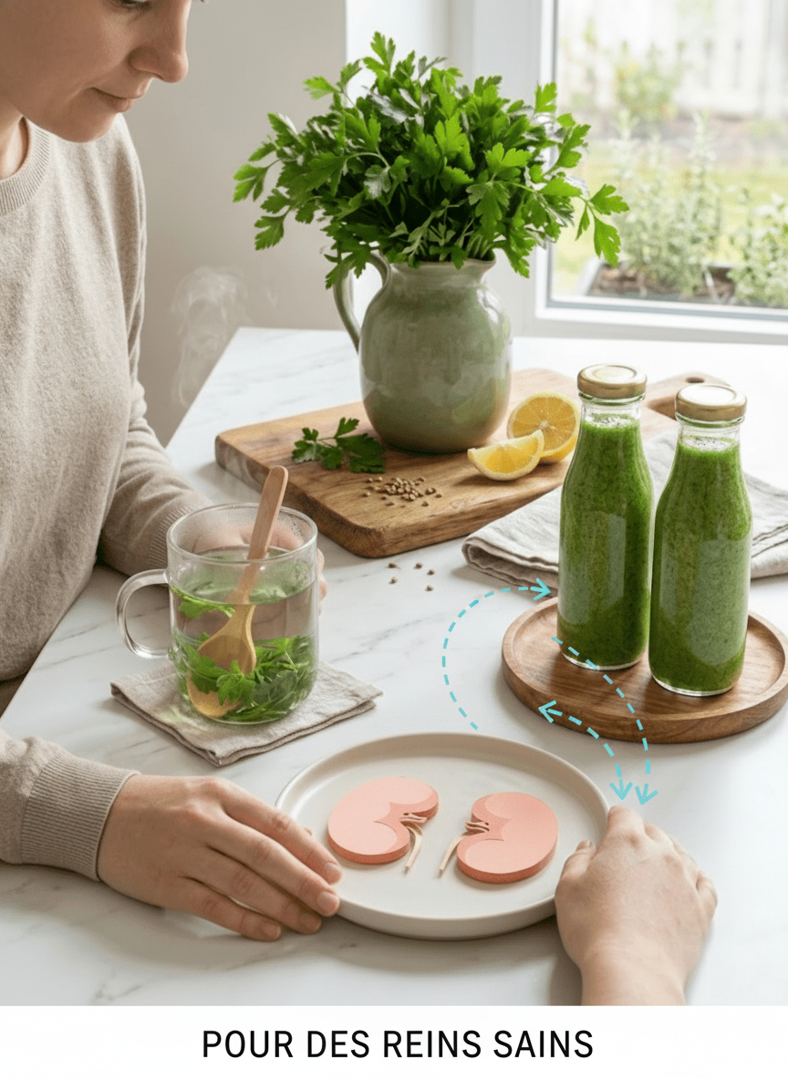 Le persil est reconnu pour soutenir activement la santé rénale en favorisant une meilleure filtration des déchets sanguins. En aidant les reins à fonctionner plus efficacement, il peut contribuer à abaisser les niveaux de créatinine, un indicateur clé de la fonction rénale, souvent élevé en cas de fatigue rénale. Cette action dépurative aide à maintenir un équilibre interne essentiel à votre bien-être général.